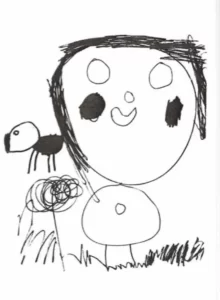 Pigen bag denne tegning har været udsat for et overgreb. Bemærk, at hun har tegnet sig selv uden arme. Det er ikke unormalt for børn, der har været udsat for overgreb, og tolkes typisk som udtryk for hjælpeløshed.