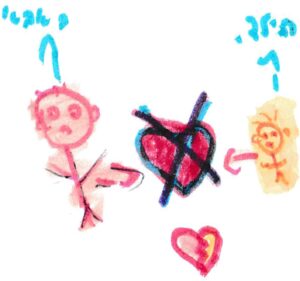 Denne tegning er lavet af en dreng, hvor faderen slår sønnen. Der mangler kærlighed fra faderens side, og barnet har et brudt hjerte, der mangler oplevelsen af kærlighed.(16)
